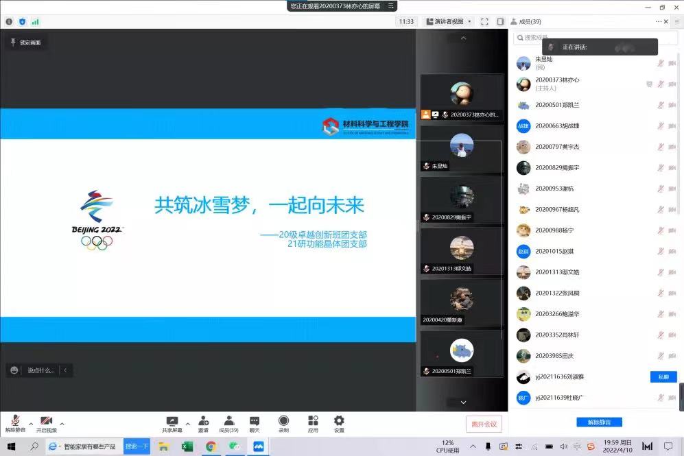活动分为“一起学冬奥”“科技助冬奥”“线上云支教”“一起向未来”四个环节。首先由明理卓越创新班团支书林亦心介绍奥运会的由来,奥林匹克格言、吉祥物等奥运文化,加深同学们对北京“双奥之城”意义的理解;随后,21研功能晶体团支书斯庆苏都结合材料专业知识,带领同学们领略冬奥会上的高科技。她指出高科技运用不仅会在冬奥筹备、比赛项目中发挥独特优势,还将在未来更好的满足人民群众对美好生活的需要,有助于让冬奥成果为全民共享;紧接着,20级创新班鲍溢华同学就假期参与的“一起云支教,共同迎冬奥”志愿服务进行了分享;最后,全体成员一起学习了习近平总书记在北京冬奥会、冬残奥会总结表彰大会上的讲话。材料学院团委书记刘欢老师对本次活动进行了总结,她指出两个支部都是我国功能晶体研究领域的后备人才,希望同学们可以传承北京冬奥精神,肩负时代使命,成为栋梁之材。王悦阳老师也指出希望加强两支部在科技创新、学风引领、党团活动上的合作,支部同学互学,共促,共成长。